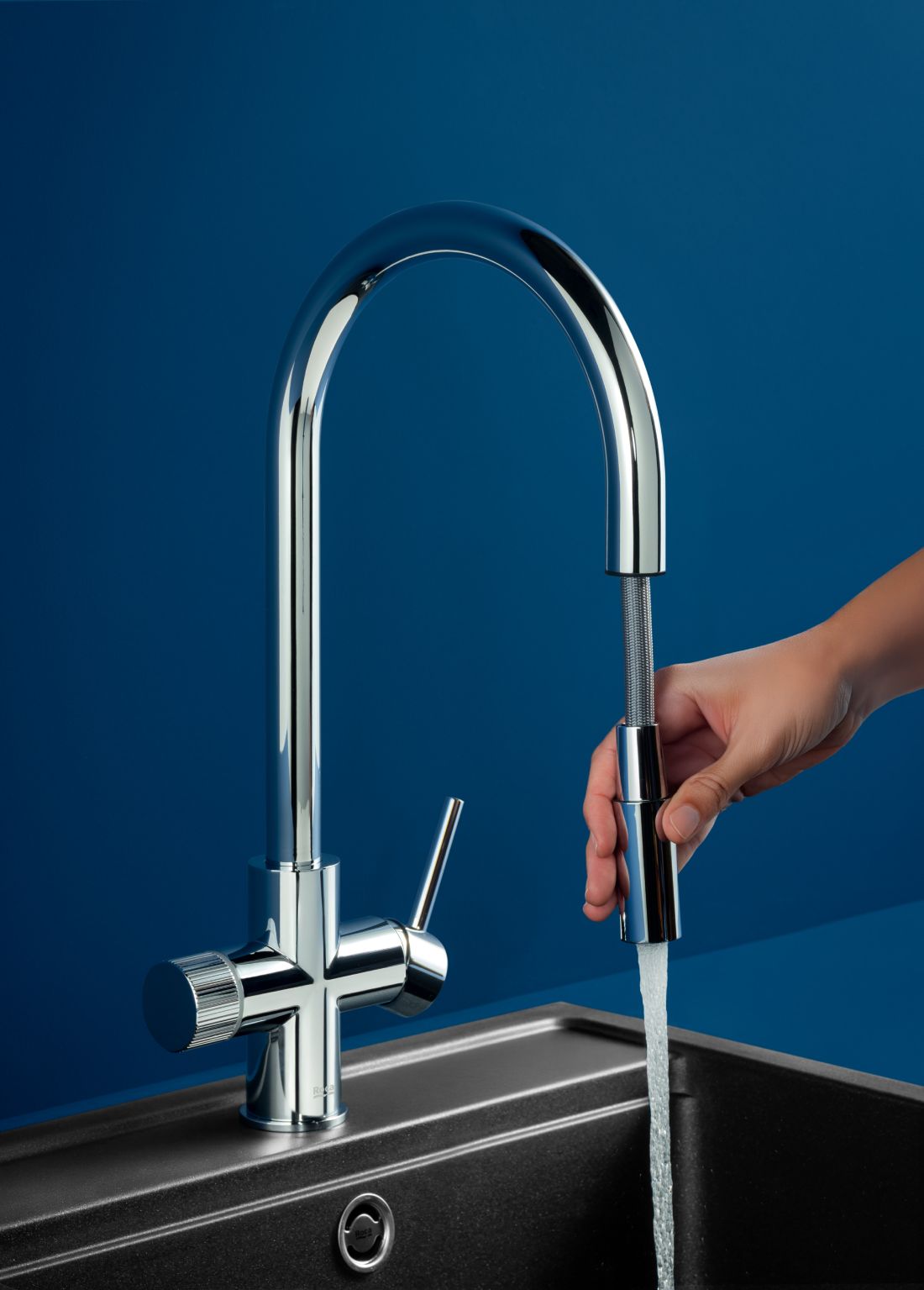 Designed as a complementary faucet, this model brings the benefits of clean, pure filtered water to any kitchen. Without the hassle of replacing an existing faucet, the single outlet filtration faucet can be installed alongside the existing setup.