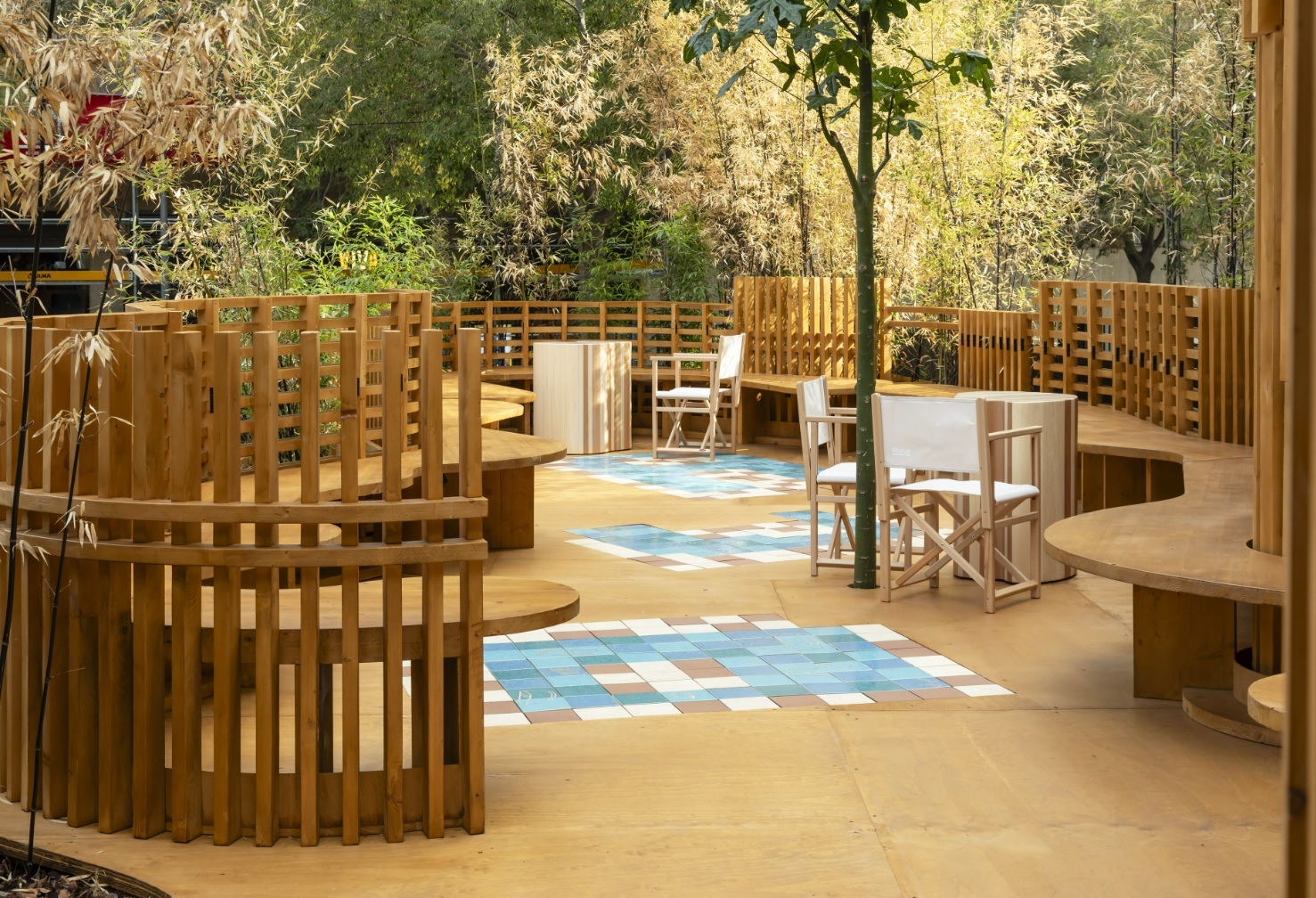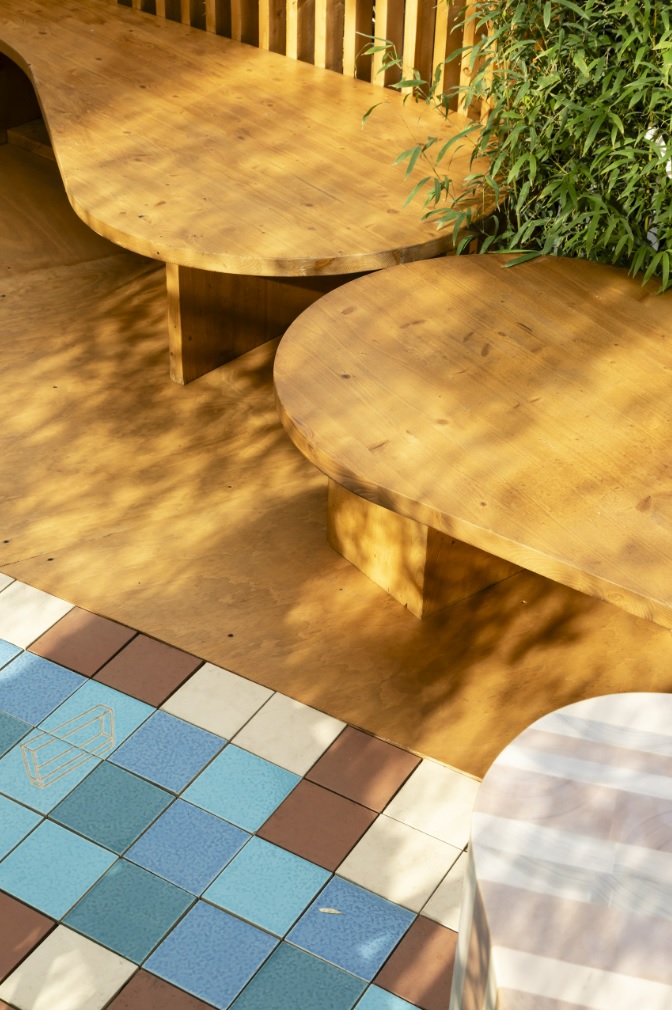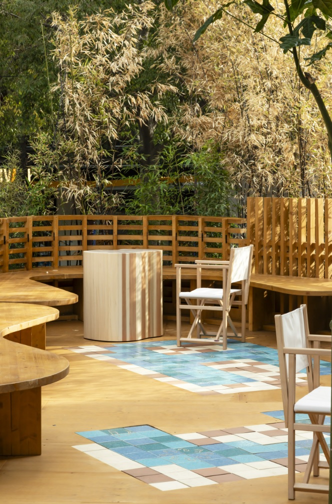 Benedetta Tagliabue describes Nutura as “a place that can be enjoyed from the inside and the outside, a place of peace and rest, built with natural elements and discovered little by little.” The pavilion’s undulating wooden and ceramic walls integrate seamlessly with Roca Gallery’s existing bamboo garden. Wooden lattices create varying levels of transparency resulting in a play of lights, shadow and texture, creating an overall sense of wellbeing and Mediterranean living. The pavilion’s floor is decorated with ceramic tiles in muted shades of blue and brown with allegorical drawings by Benedetta Tagliabue – EMBT Architects of Roca’s latest collections. These two collections lend their name to the pavilion: the Nu faucet collection, designed by Inma Bermúdez; and the Tura bathroom collection by Andreu Carulla.