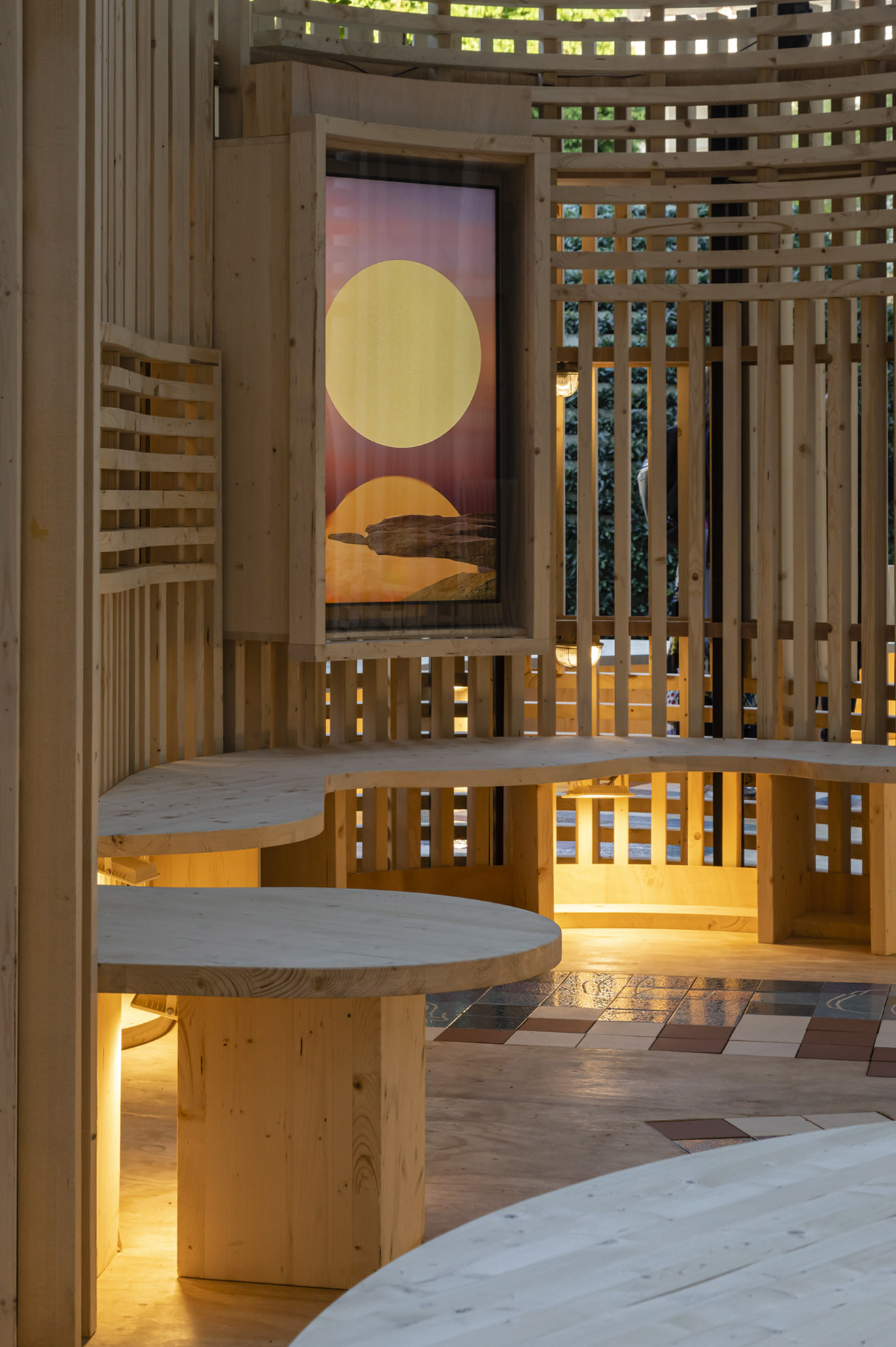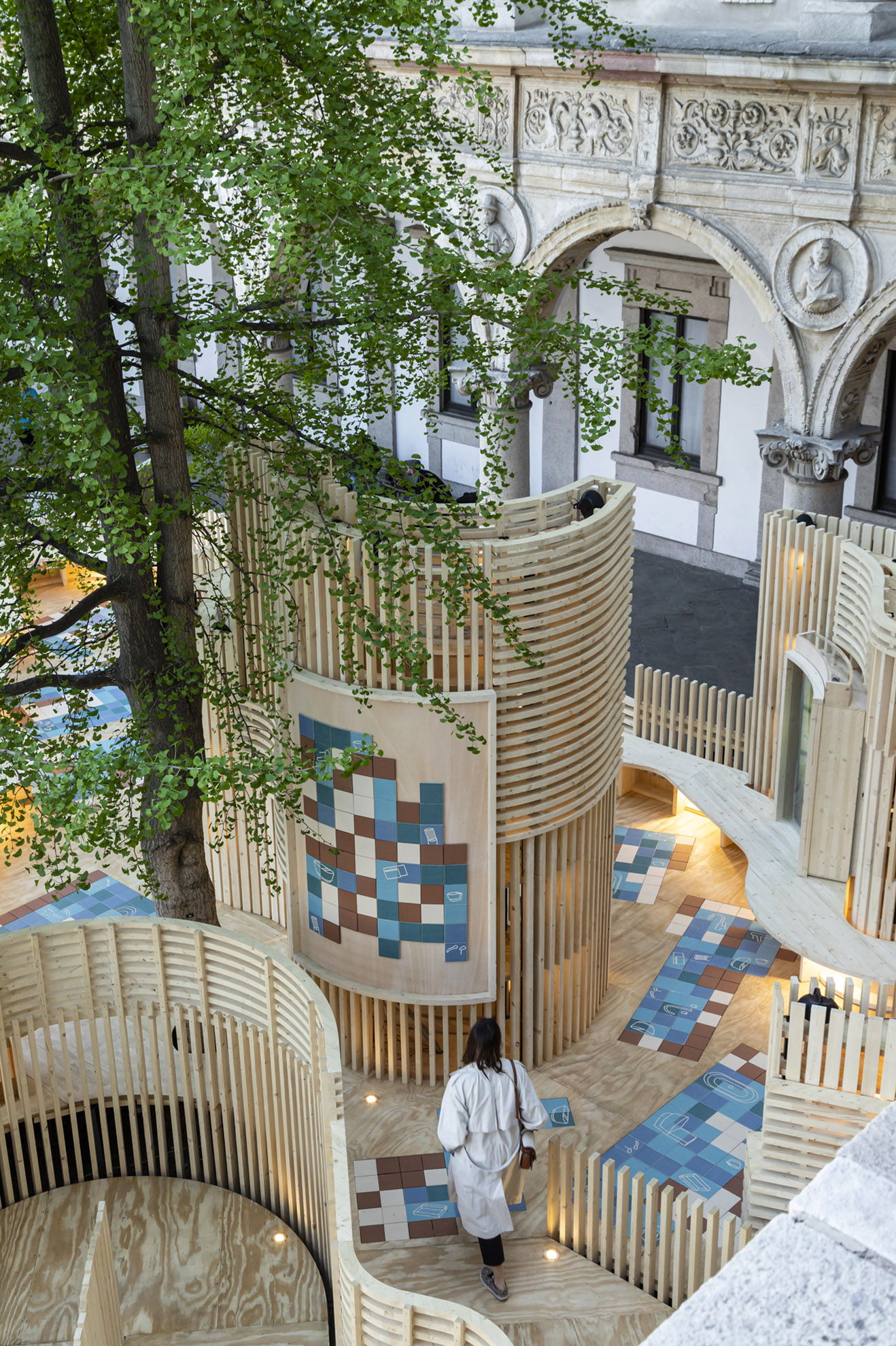 A sinuous and multisensory passage between undulating wood and ceramic walls inspired by 20th century Barcelona architecture.