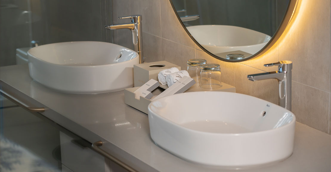 At the heart of the deluxe experience at this seaside hotel is the Palma drop-in bath - paired with the elegant Escuadra freestanding bath/shower mixer - a stunning symbol of indulgence and relaxation that beckons guests to unwind in serene comfort. Moving to the shower, guests are immersed in a blissful experience with the Raindream showerhead, complemented by the versatile Plenum hand shower kit and the T-1000 thermostatic bath/shower mixer. The choice of stimulating pulses, gentle rain or invigorating downpours provides an immersive experience to suit any mood. The soothing flow of water, combined with carefully curated lighting that softly reflects across the room, further emphasise the overall sense of calm and serenity.