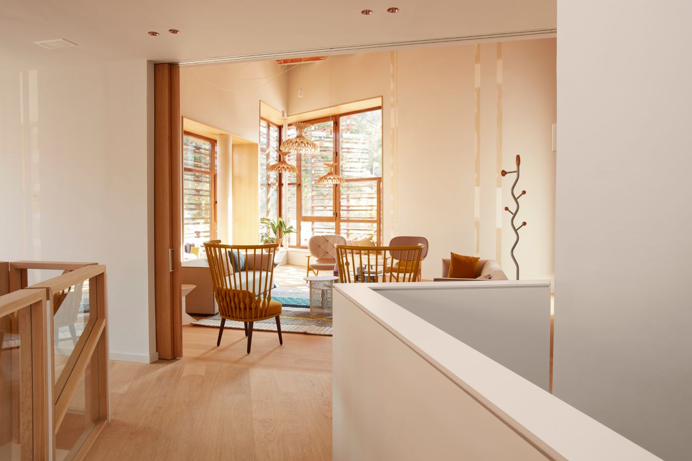 The bathroom on the first-floor features Roca fixtures selected from the Access and Victoria Pro collections, and were chosen for their ergonomic, versatile and sophisticated solutions. Among the fixtures featured are a folding grab bar with built-in toilet roll holder, the Victoria Pro faucet with a specially crafted handle for individuals with reduced mobility, and the Access wall-hung basin.