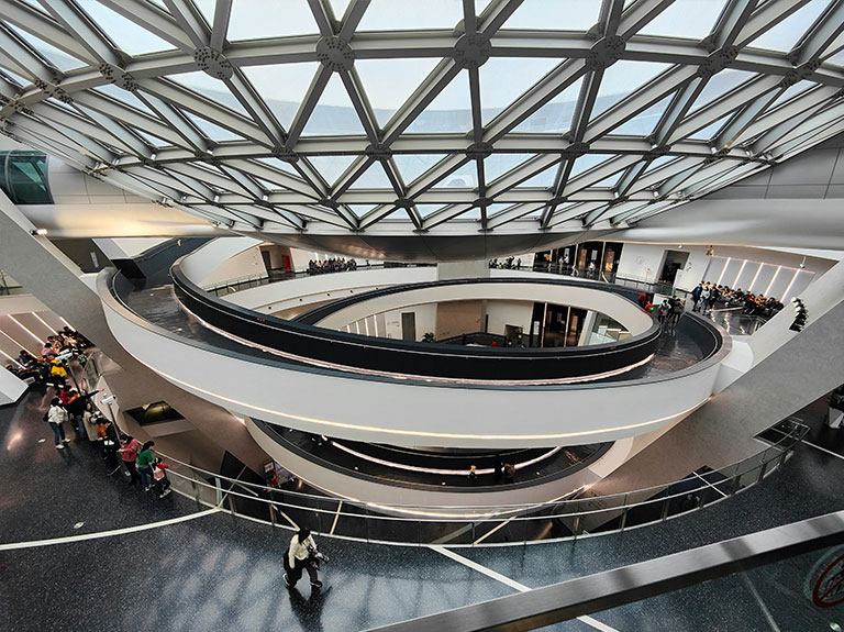 Museum's architecture beautifully captures the essence of the galaxy and seamlessly integrates with urban ecology. The use of arches on the façade and the winding greenery surrounding the museum represent the spiral arms of the galaxy. Inside, the proportional relationship of the planetarium sphere to Shanghai’s Dishui Lake reflects the Earth-Sun dynamic, creating a cohesive thematic representation.
